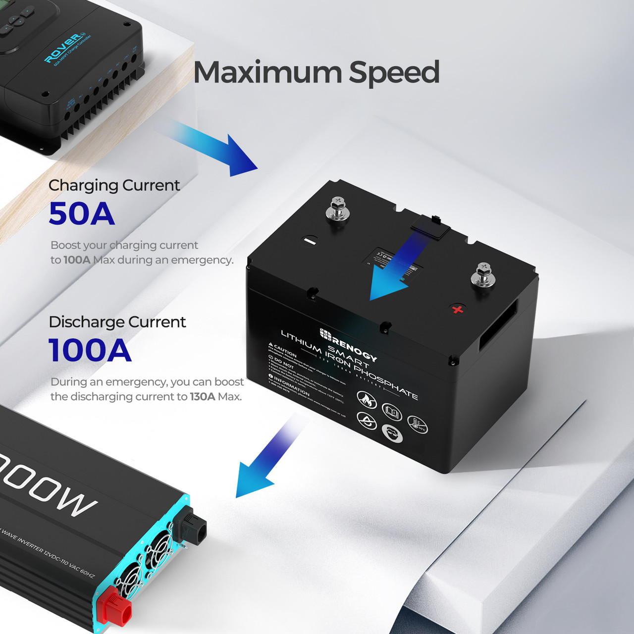 【Premium BMS Circuit】 Incredibly advanced BMS provides over 20 protections designed to allow a peak current of 150A to pass through, deliver up to 1C charging and 1.3C discharging during an emergency. 50% more heat dissipation area will maximize the safety of your off-grid use.