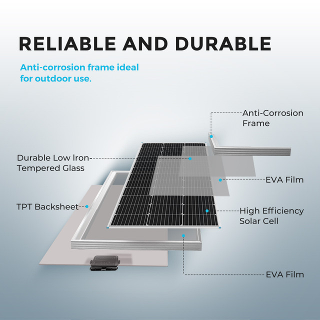 【Solid Quality】 Advanced encapsulation material with multi-layered sheet laminations to protect cells from physical damage or distortion, improving cell performance and providing a long service life. Corrosion-resistant aluminum frame ideal for outdoor use. TPT back sheet dissipates excess heat, ensuring smooth output performance. EL tested; 5-year material and workmanship warranty.